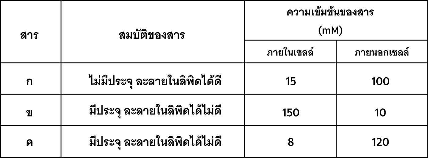 สารขนาดเล็ก 3 ชนิด มีสมบัติที่แตกต่างกันและมีความเข้มข้นของสารภายในและภายนอกเซลล์ก่อนเริ่มลำเลียงเข้าสู่เซลล์ ดังตาราง