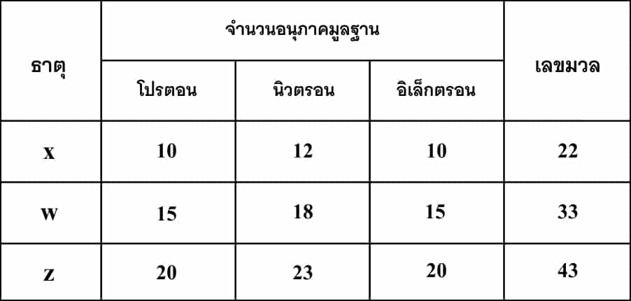 จากข้อมูลสามารถระบุจำนวนอนุภาคมูลฐานของธาตุสมมติ X W และ Z ได้ดังนี้