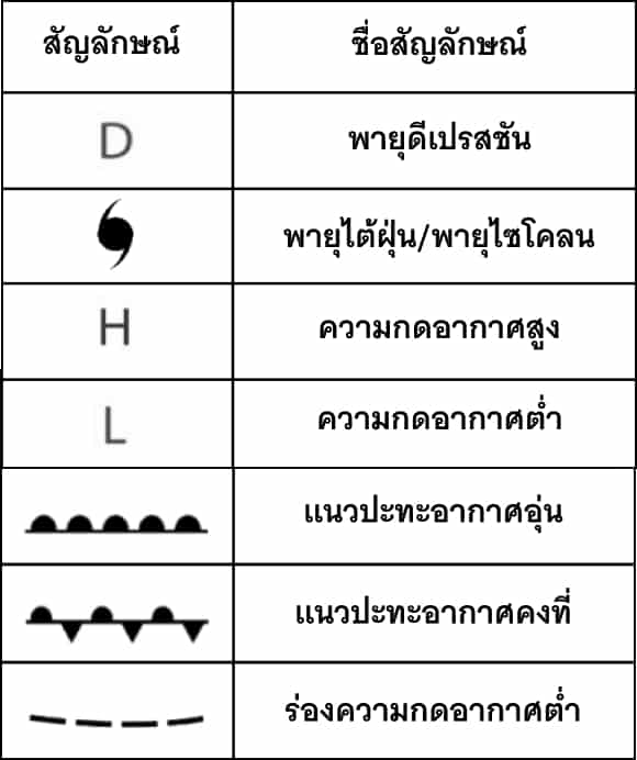 คือ แนวปะทะอากาศเย็น แนวปะทะอากาศรวม และร่องความกดอากาศต่ำ ตามลำดับ หากพบสัญลักษณ์เหล่านี้ปรากฏอยู่บริเวณใดบนแผนที่อากาศผิวพื้น หมายความว่า พื้นที่บริเวณนั้นจะมีลมแรงและมีฝนฟ้าคะนอง