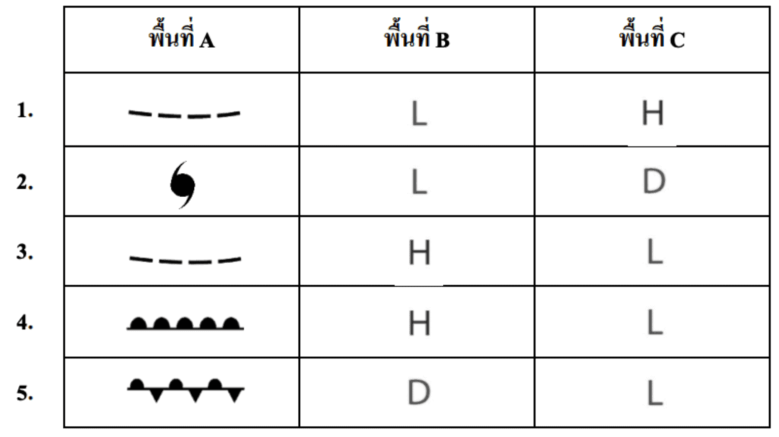 ข้อใดระบุสัญลักษณ์แสดงสภาพลมฟ้าอากาศบริเวณกว้างที่มีโอกาสพบบนแผนที่อากาศผิวพื้นของพื้นที่ทั้ง 3 บริเวณ