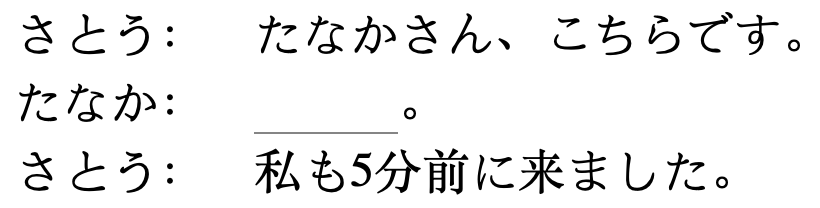 ตัวเลือกข้อ 4. ถูก เพราะทานากะพูดว่า “ขอโทษที่มาช้าครับ” สอดคล้องกับคำตอบของซาโต้ที่ว่า “ผมก็เพิ่งมาได้ 5 นาที”