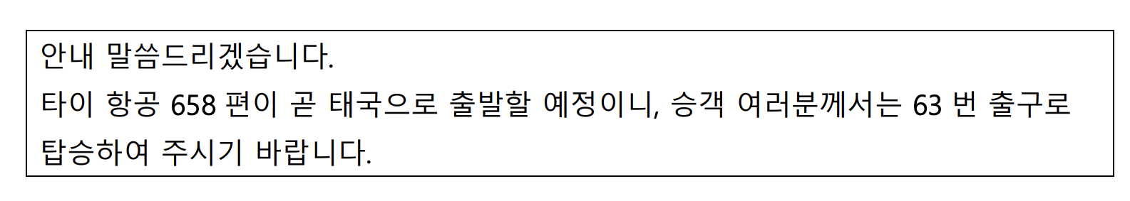 โจทย์ : ประกาศค่ะ สายการบินไทยเที่ยวบินที่ 658 กำลังจะออกเดินทางไปยังประเทศไทย ขอให้ท่านผู้โดยสารไปยังประตูทางออกหมายเลข 63 ด้วยค่ะ