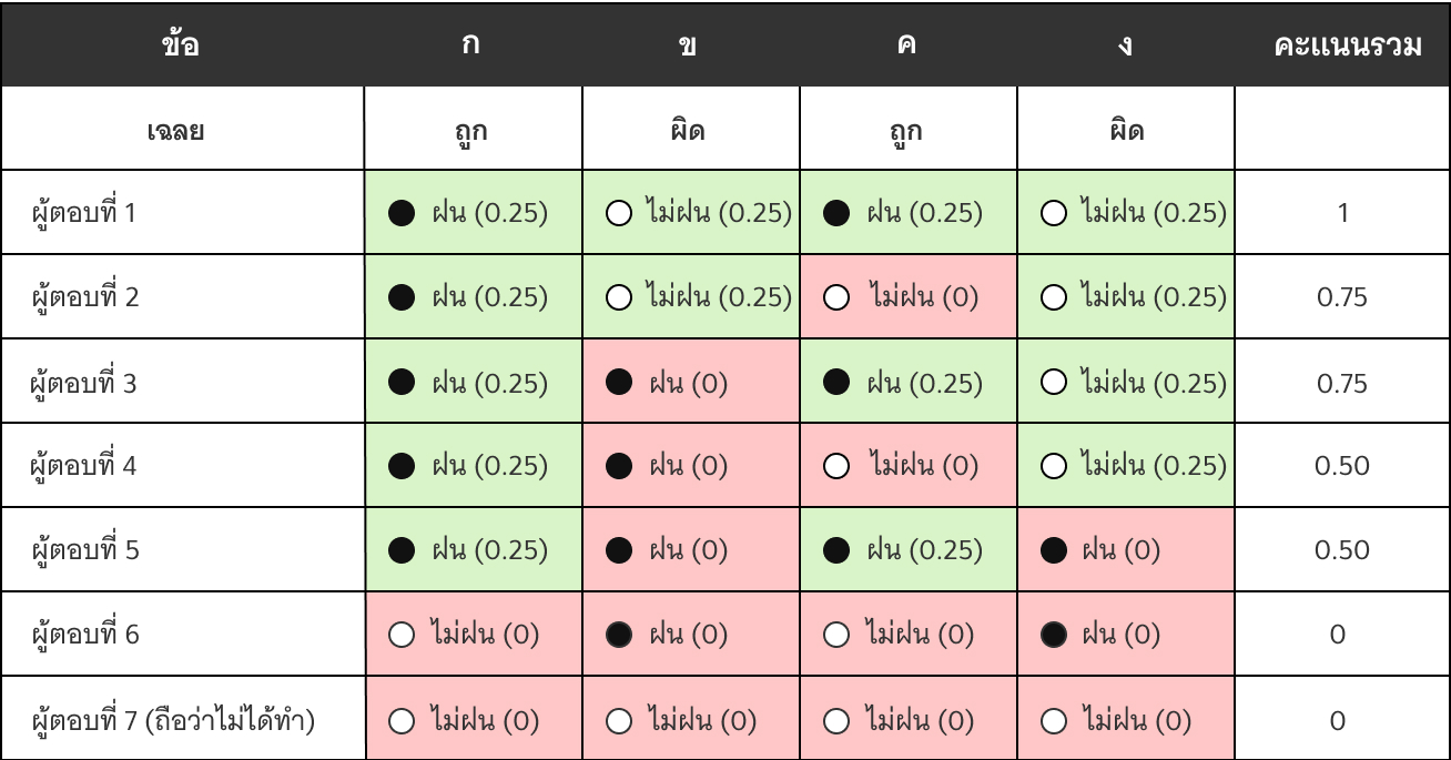 ตัวอย่างการให้คะแนน (สมมติคำตอบที่ถูกคือ ก. และ ค.)